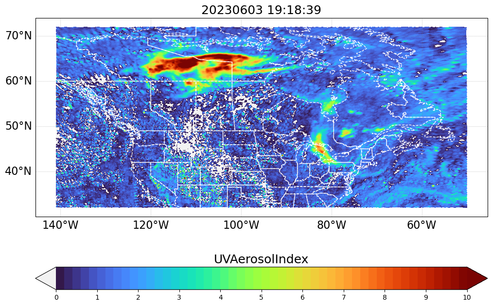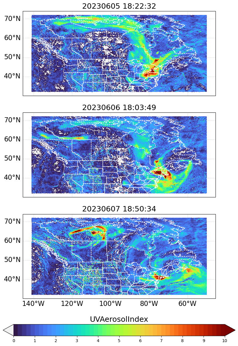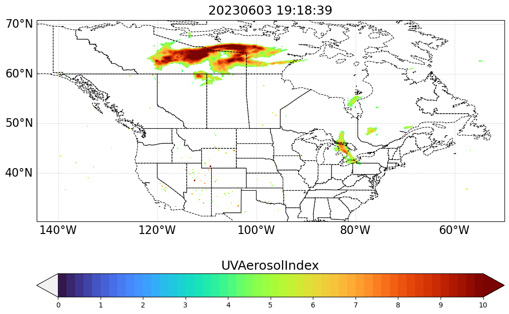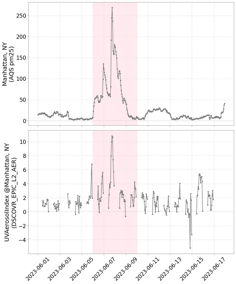This notebook demonstrates how to visualize the spatial transport and temporal variations of UV Aerosol Index (UVAI) from DSCOVR EPIC, and compares those measurements to EPA air quality data for the same time period. The figures from this notebook were included in the poster “Impact of Canadian Wildfires on Mid Atlantic’s Region Air Quality: An Analysis Using ASDC Data” (A41O-2864) presented at the 2023 American Geophysical Union (AGU) Fall Meeting.