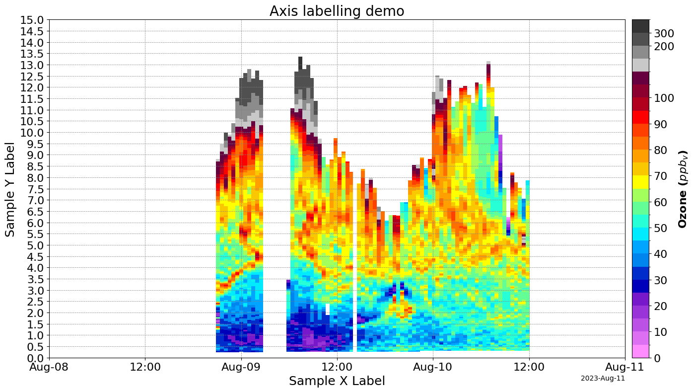data.tolnet_curtains(xlabel="Sample X Label", ylabel="Sample Y Label", title="Axis labelling demo")