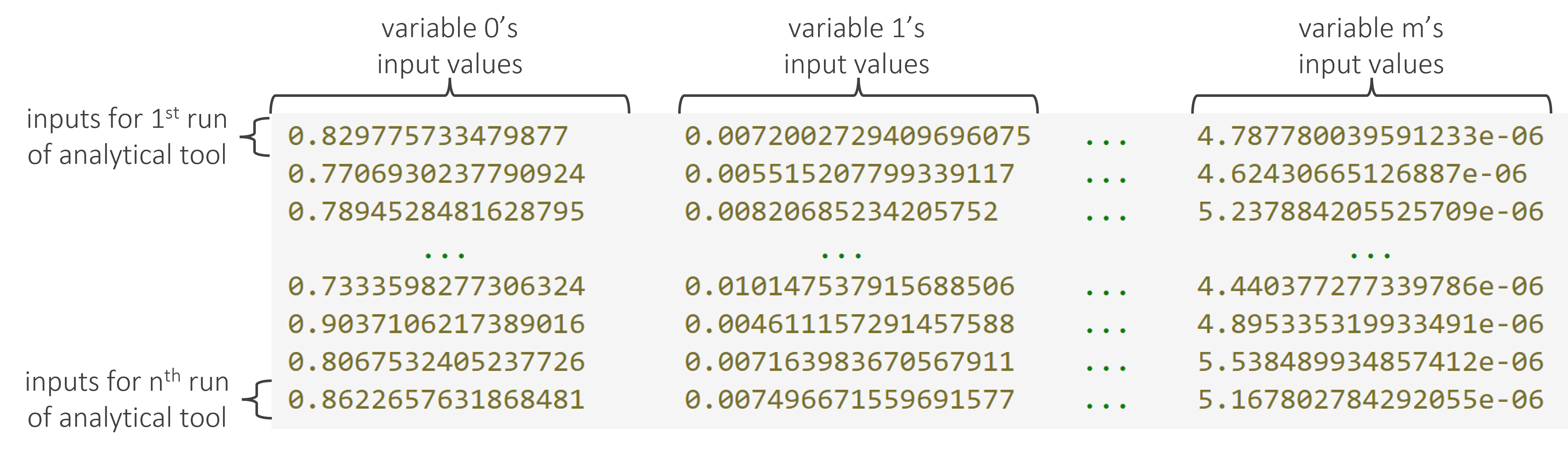 Each row contains all of the input values for one run of the program UQPCE is modeling