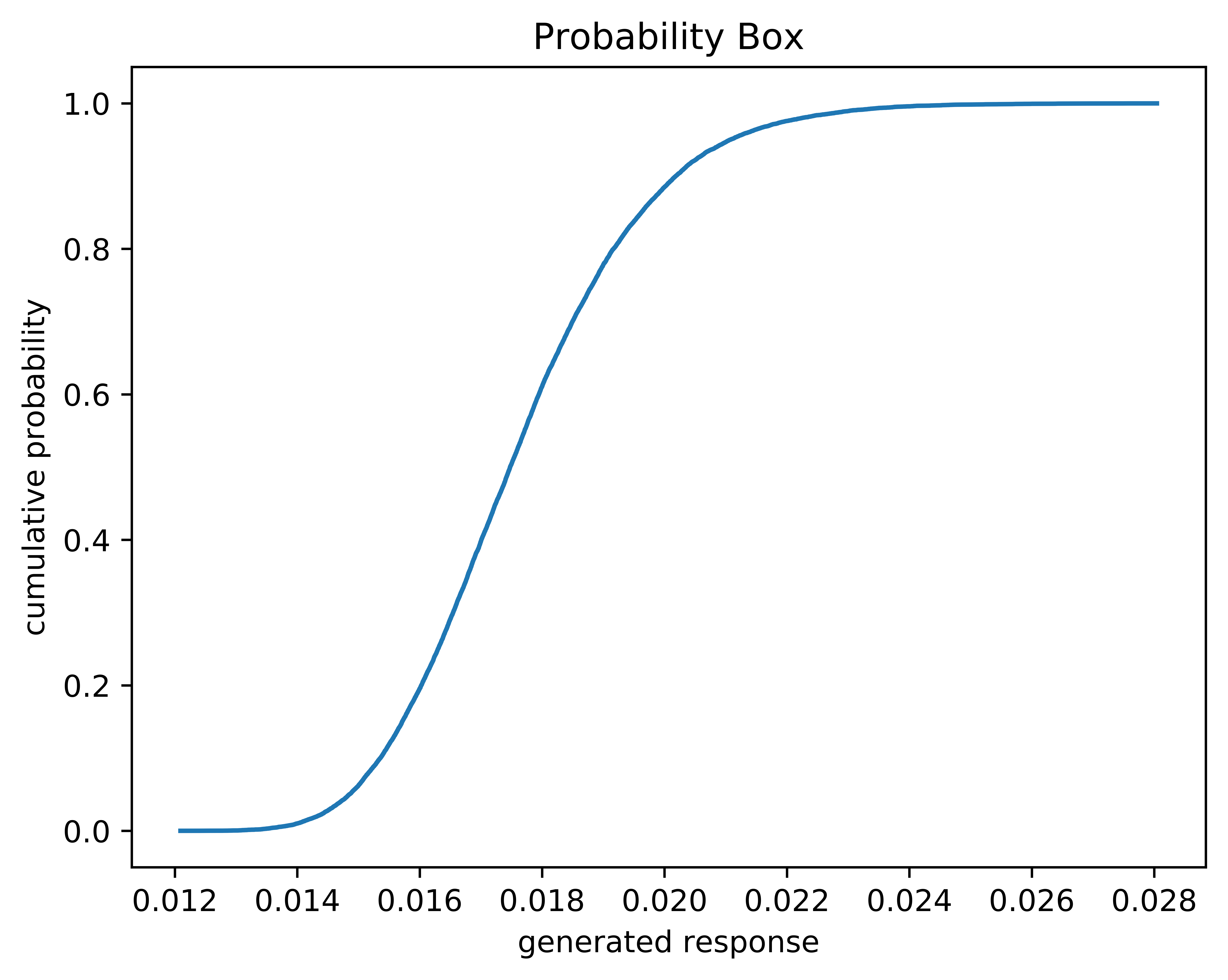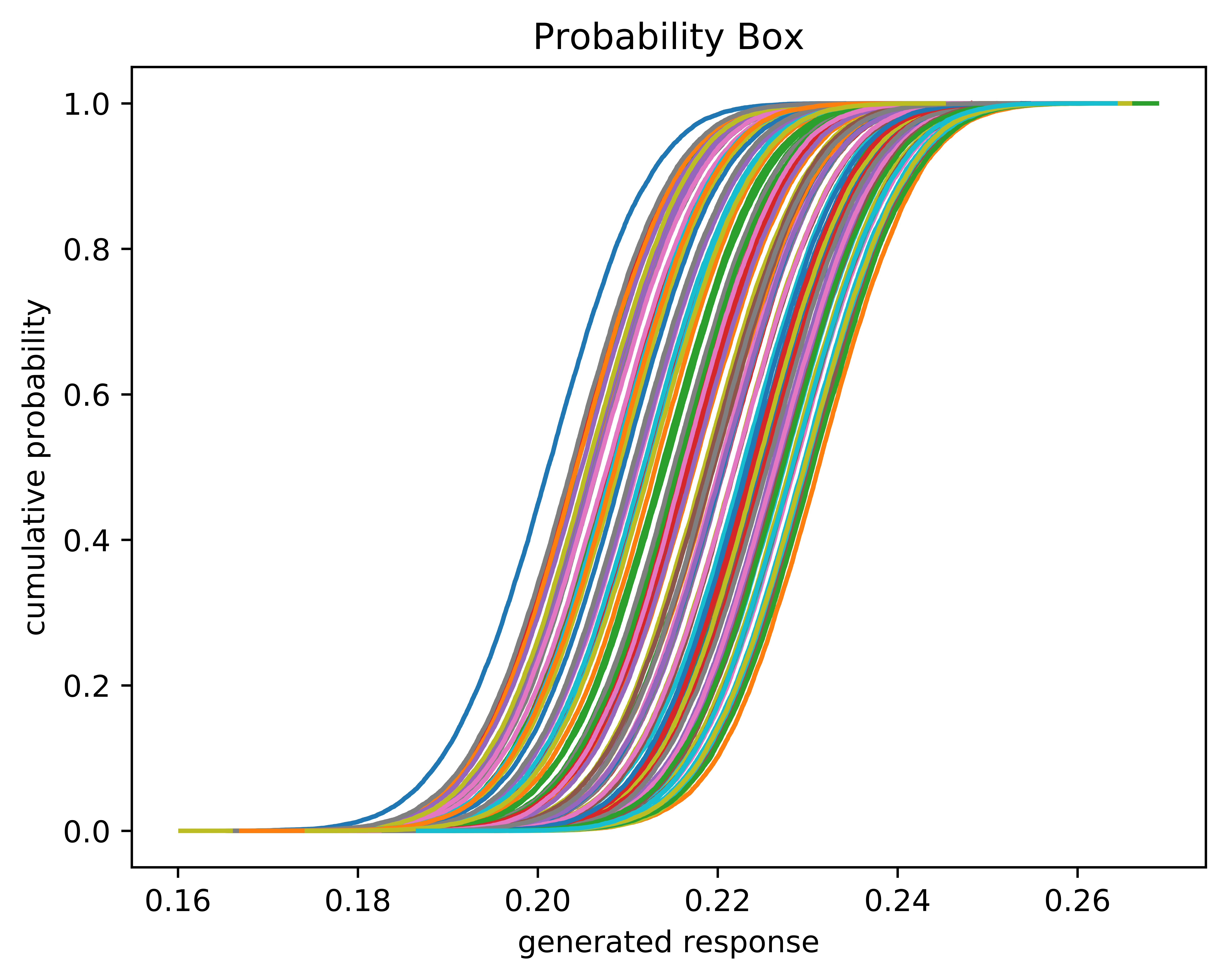 The above figures show the probability box plot and the lower and upper confidence interval convergence for the OneraM6 airfoil case. Since none of the variables are epistemic, there is only one curve for the probability box. As shown, these confidence intervals did not converge within the accepted threshold and instead used the maximum number of samples allowed. It is possible for the curves to converge and not appear to be converged as long as the last two differences between confidence intervals are within the specified convergence threshold.