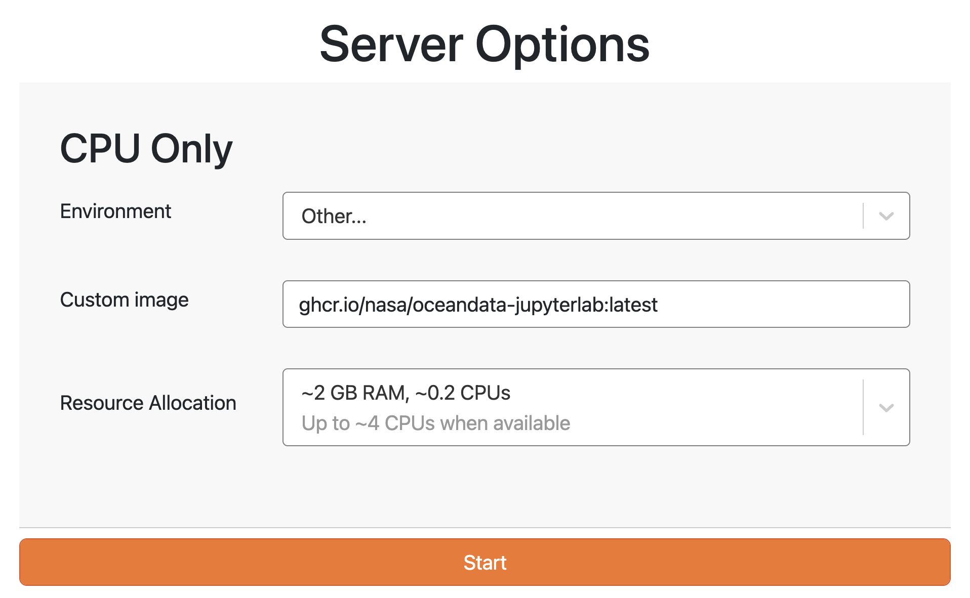 For the first option, login to your JupyterHub and start a server from the ghcr.io/nasa/oceandata-jupyterlab image.
